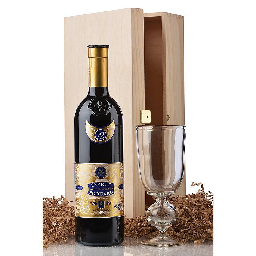 This gift set features a bubble glass and a bottle of Jade VS 1898 absinthe, a replica of a famous Swiss absinthe Verte from one century ago. Both are packed in an elegant wooden box. The glass will be shipped separately.