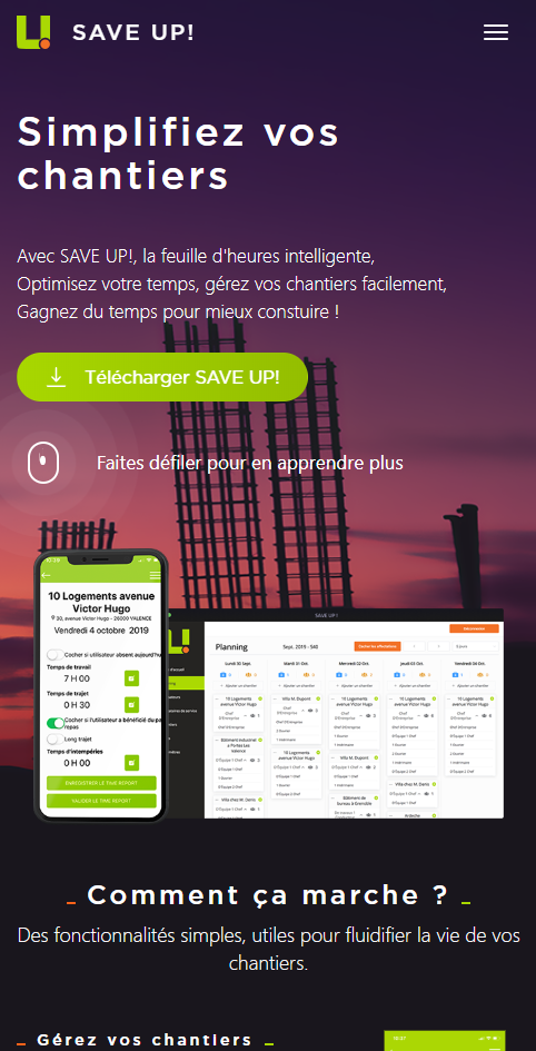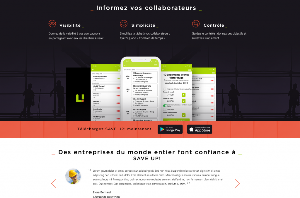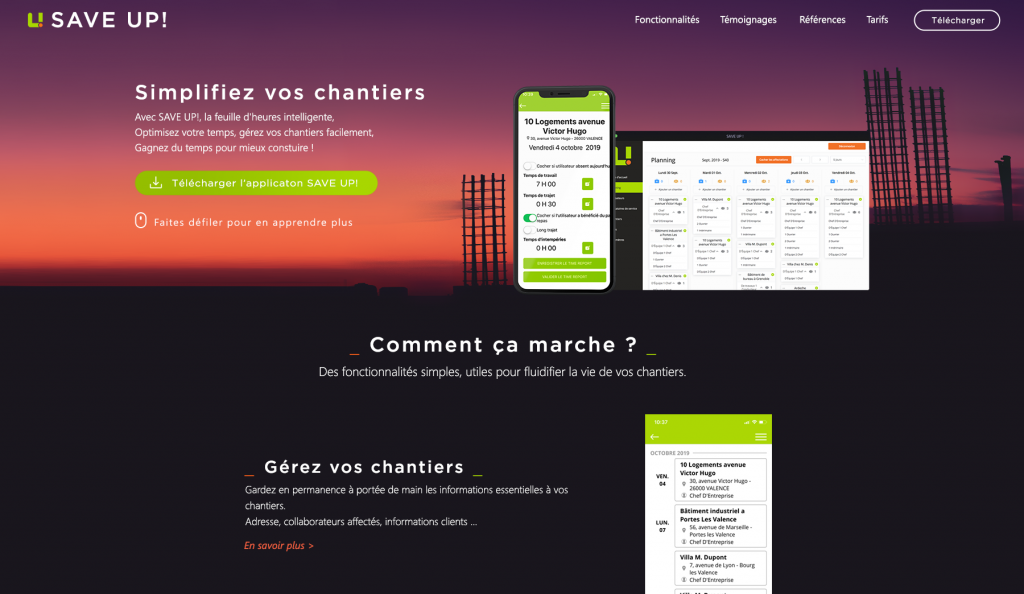 Un webdesign coloré, chaleureux, de façon à égailler un sujet froid et fonctionnel : la gestion de chantier. L’idée qu’essaie de véhiculer ce design pourrait se résumer ainsi : avec saveup, gérer vos chantiers devient un jeu d’enfant.