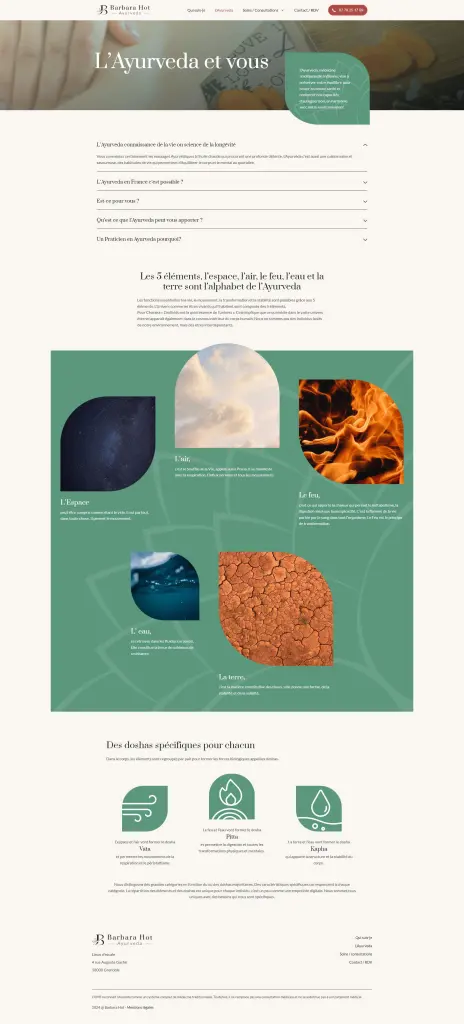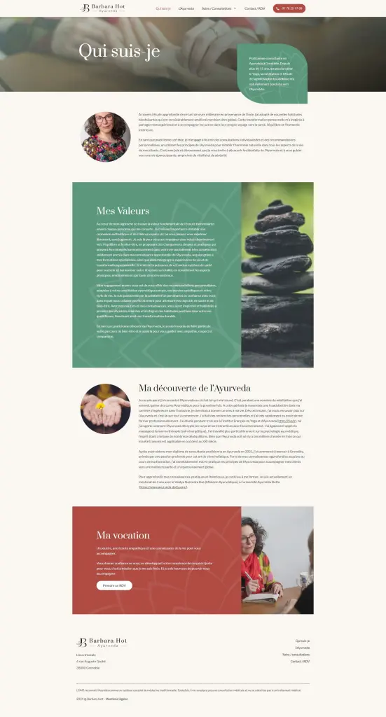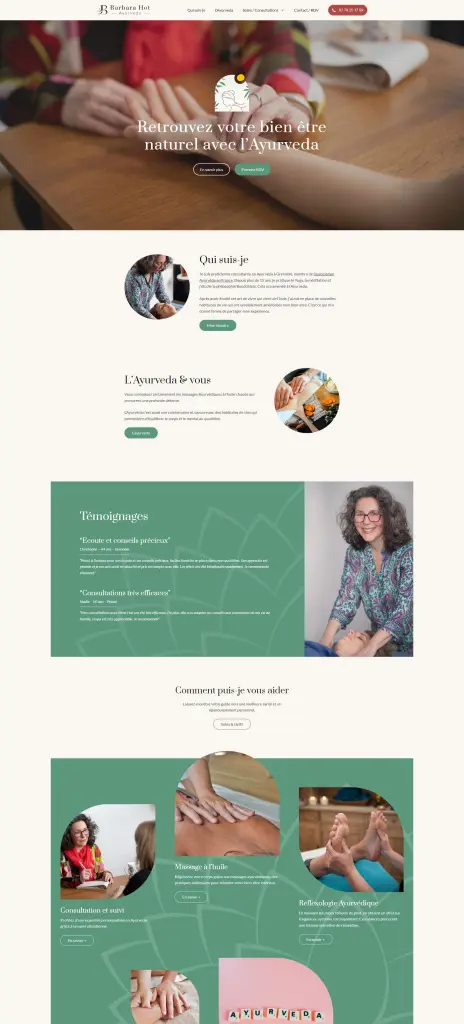 Site pour une praticienne consultante en Ayurvéda. Avec module de réservation en ligne, qui permet aux patients de voir les plages disponibles et de les réserver et payer en ligne en toute autonomie.