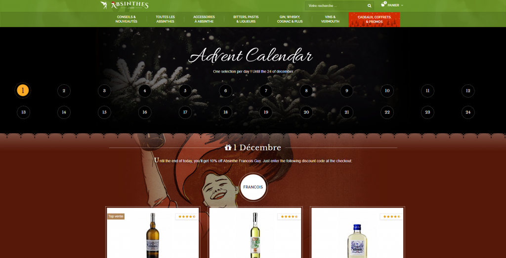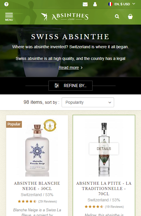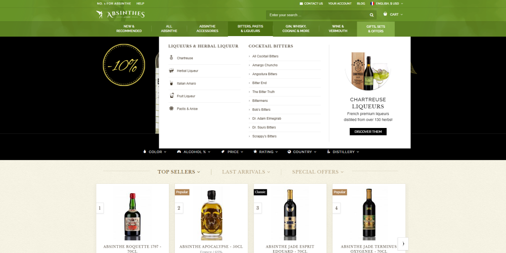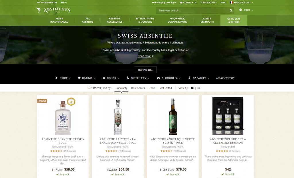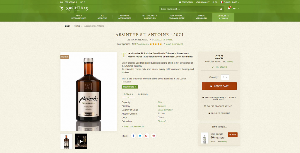 La fée verte. C’est l’autre nom d’un spiritueux envoutant : l’absinthe. Cette liqueur étant majoritairement associée à la couleur verte, c’est la couleur dominante retenue pour la charte graphique de cette boutique de spiritueux, auquel sont adjoints des nuances de noir, beige et blanc, des couleurs très utilisées dans le domaine des spiritueux produits artisanalement, comme le sont la plupart des produits de cette boutique.